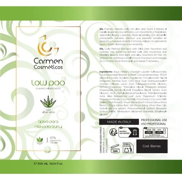 El Low Poo Champú Hidratante Vegano de Carmen Cosméticos es una opción ideal para quienes buscan una limpieza suave y efectiva sin sulfatos ni siliconas, respetando la estructura natural del cabello rizado. Su fórmula vegana está enriquecida con ingredientes naturales que nutren e hidratan profundamente, logrando rizos definidos, suaves y con movimiento. Este champú es apto para el Método Curly, ayudando a mantener la salud y vitalidad de tus rizos sin comprometer el medio ambiente.