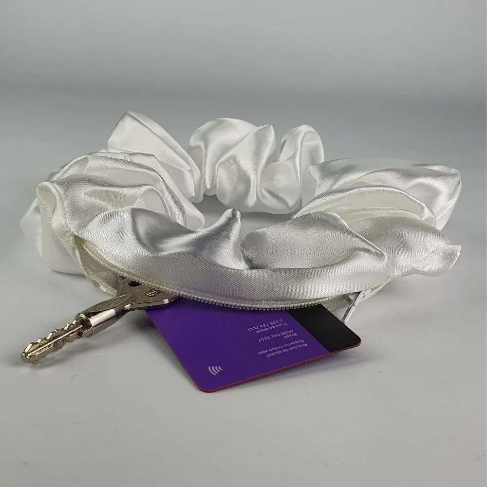 Pero eso no es todo. Nuestro Scrunchie Secret cuenta con una característica única: una cremallera estratégicamente ubicada que te permite guardar tus pertenencias más importantes. Ya no tendrás que preocuparte por llevar una bolsa contigo, ya que este ingenioso scrunchie te brinda la libertad de llevar tus llaves, lápiz labial, dinero o incluso una tarjeta de crédito de forma segura y discreta.
